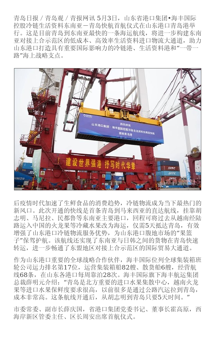 山東省港口集團?海豐國際控股冷鏈生活資料?東南亞